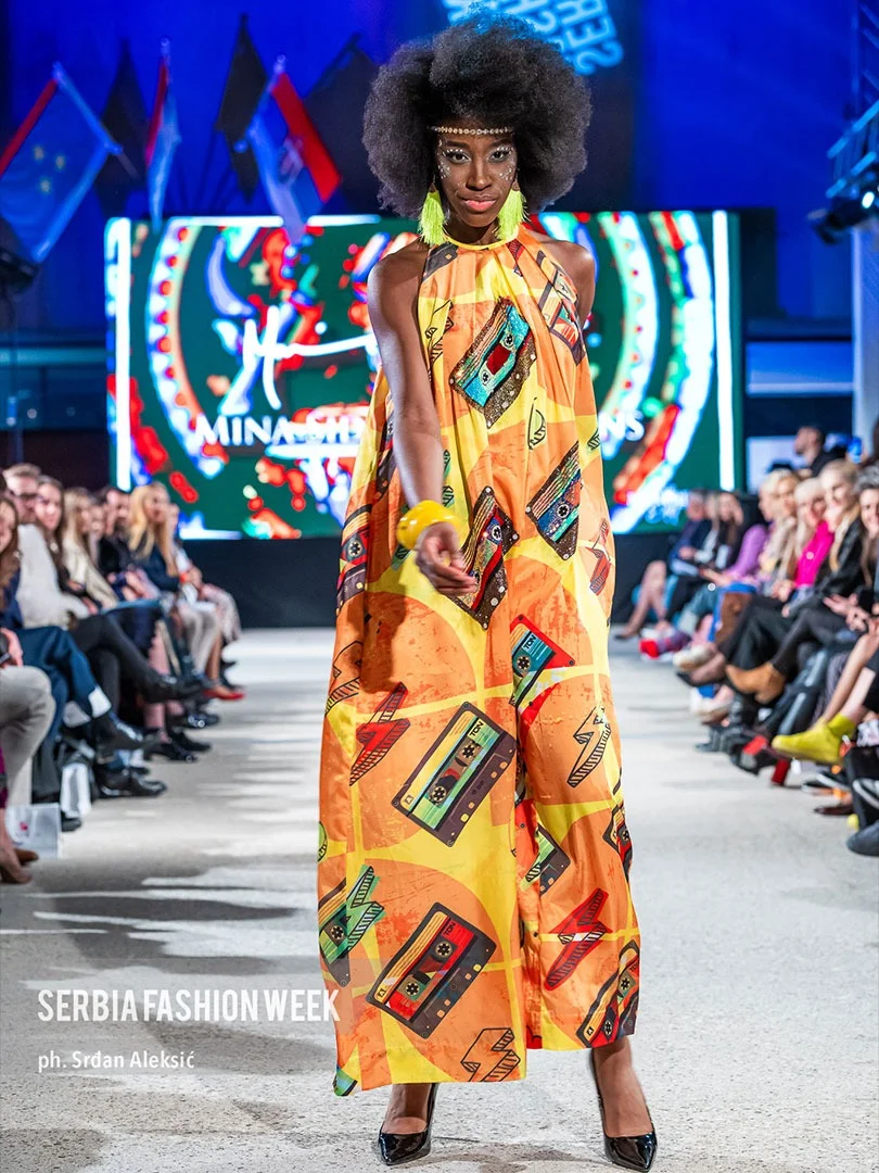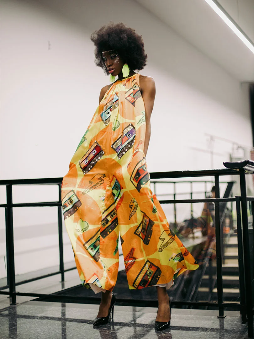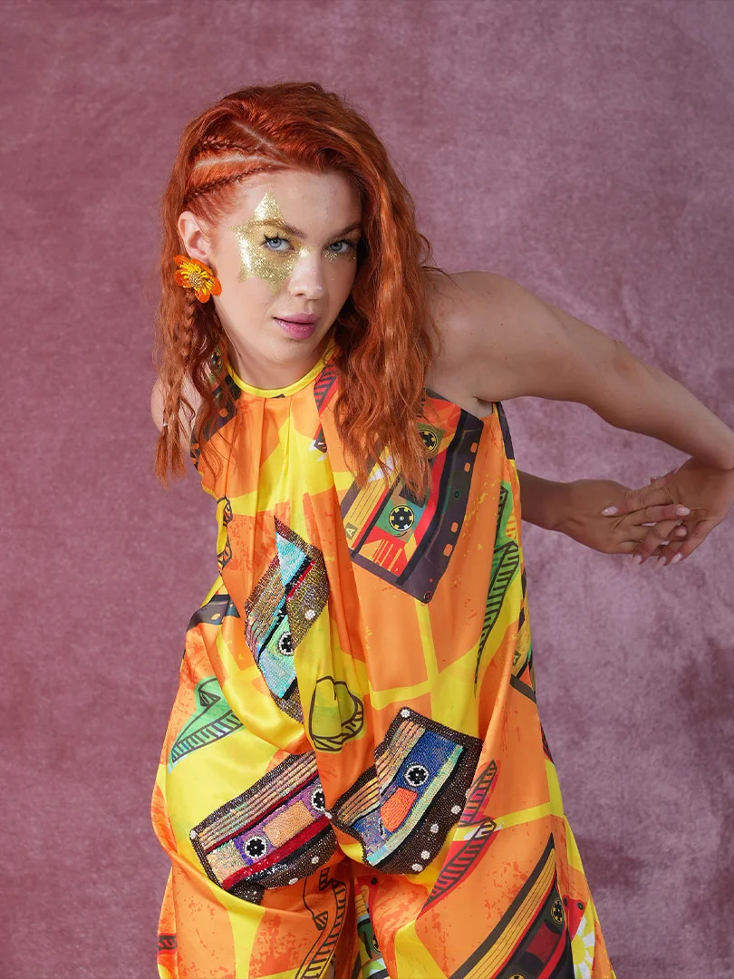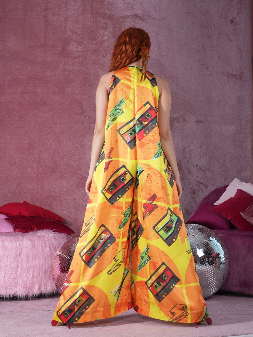 Introducing the Musical Tangerine Jumpsuit, a bold and imaginative piece that captures the essence of vintage flair with a contemporary twist. Adorned with vibrant cassette-inspired prints, this jumpsuit stands out as a statement of artistic