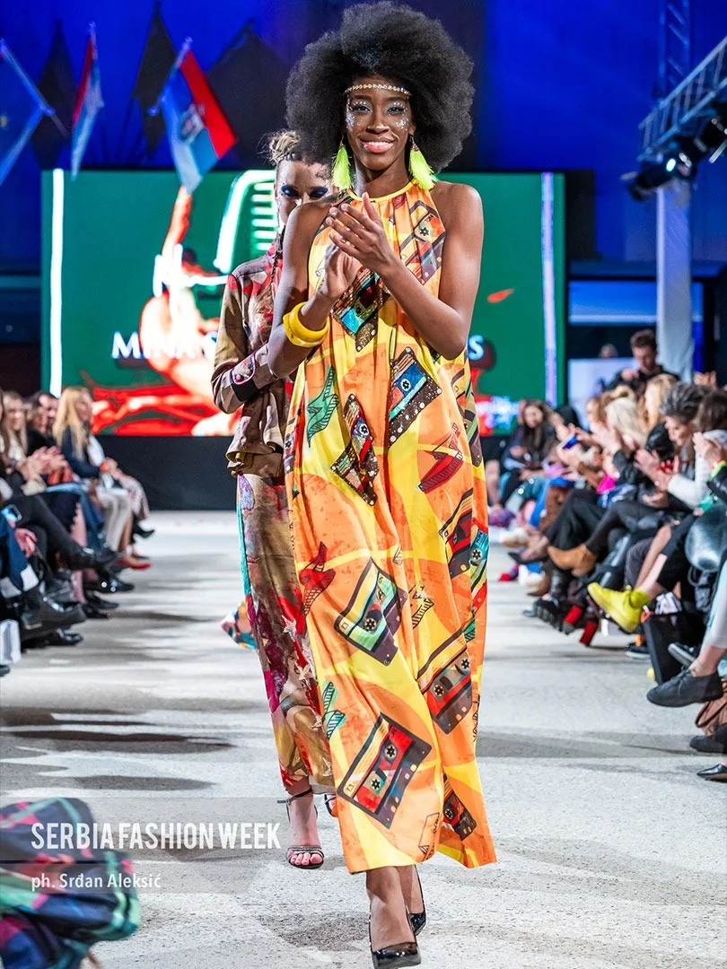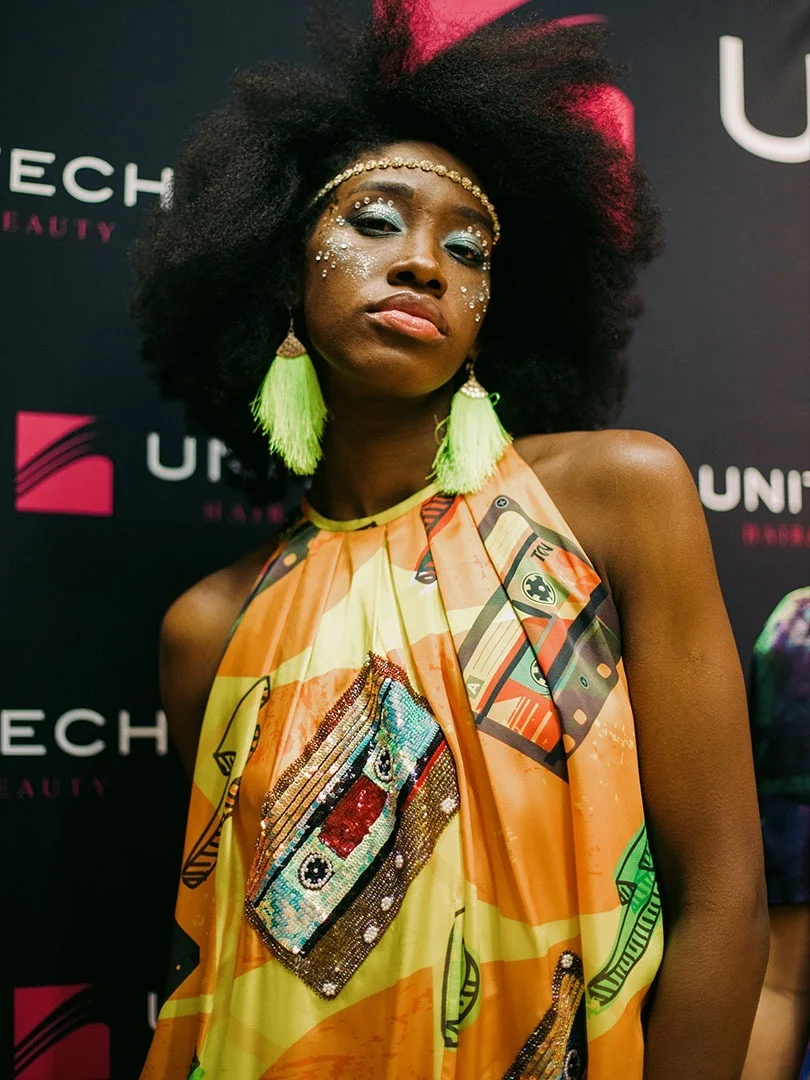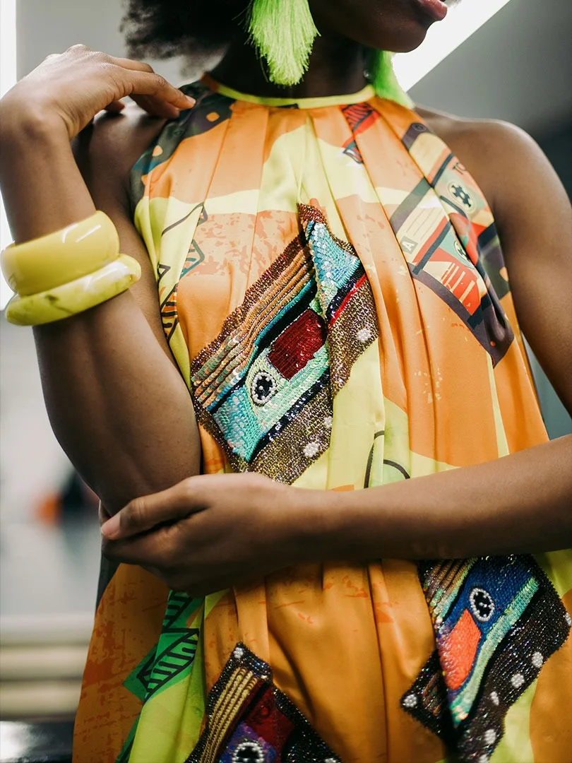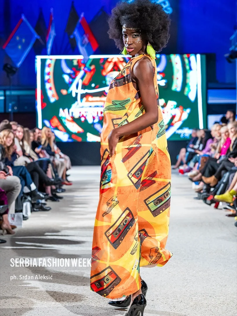 Introducing the Musical Tangerine Jumpsuit, a bold and imaginative piece that captures the essence of vintage flair with a contemporary twist. Adorned with vibrant cassette-inspired prints, this jumpsuit stands out as a statement of artistic